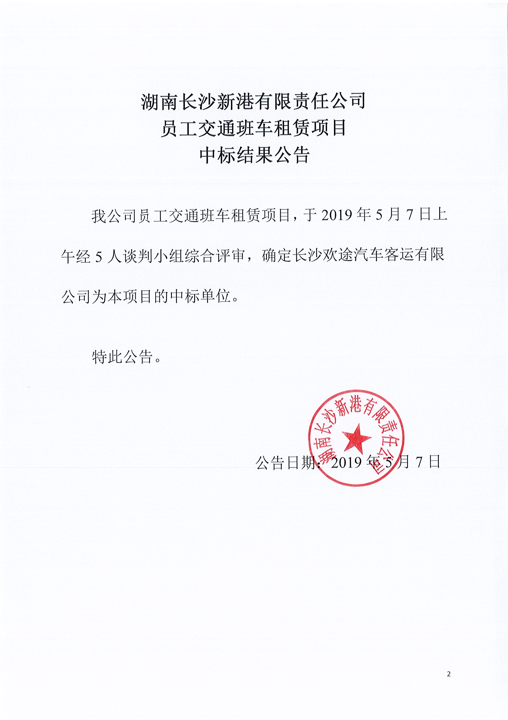 湖南長(zhǎng)沙新港有限責(zé)任公司員工交通班車(chē)租賃項(xiàng)目中標(biāo)結(jié)果公告